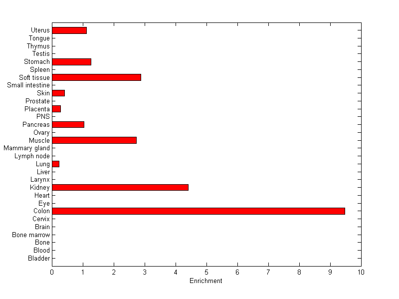 The expression level is normalized with tissue-library size. Each value for a gene in a tissue is a ratio of observed ESTs to the expected one in this tissue. The expected number of ESTs is the product of total ESTs of the gene and the fraction of total ESTs in the tissue among all ESTs in 30 tissues.
