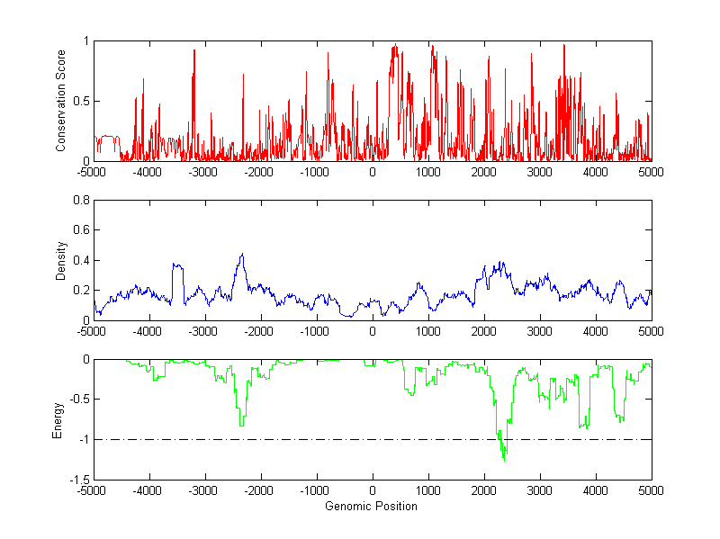 The energy profile (green curve) is about energy for module detection based on TF interaction. The positions with energy less than -1 indicate the existence of CRMs.