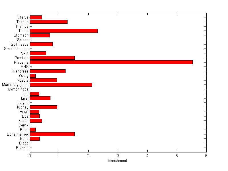 The expression level is normalized with tissue-library size. Each value for a gene in a tissue is a ratio of observed ESTs to the expected one in this tissue. The expected number of ESTs is the product of total ESTs of the gene and the fraction of total ESTs in the tissue among all ESTs in 30 tissues.