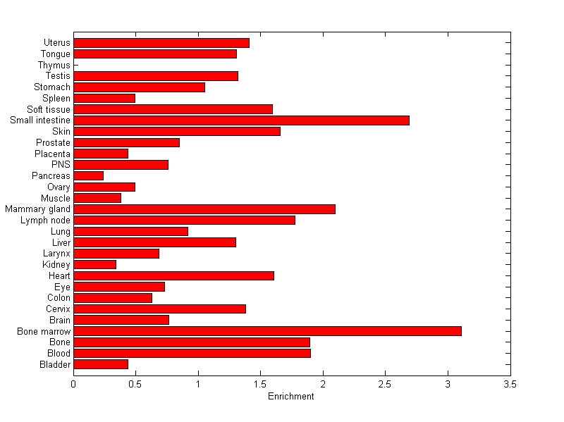 The expression level is normalized with tissue-library size. Each value for a gene in a tissue is a ratio of observed ESTs to the expected one in this tissue. The expected number of ESTs is the product of total ESTs of the gene and the fraction of total ESTs in the tissue among all ESTs in 30 tissues.