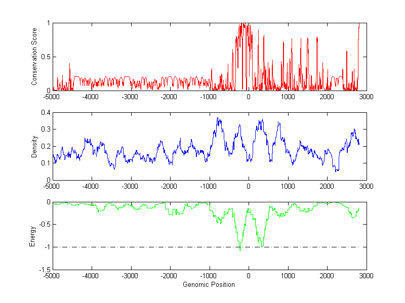 About the profiles: The conservation profile (red curve) is about conservation scores of the promoter sequences. Conservation was determined from an eight-way alignment of human, chimpanzee, dog, mouse, rat, chicken, zebrafish and fugu sequences. The conservation was quantified by a conservation score between 0 and 1, with 1 as highest conservation. The conservation score was obtained from UCSC genome databases. The density profile (blue curve) is about density of all TF binding sites. The energy profile (green curve) is about energy for module detection based on TF interaction. The positions with energy less than -1 indicate the existence of CRMs. Download: Conservation profileDensity profile Energy profile CRM summary |