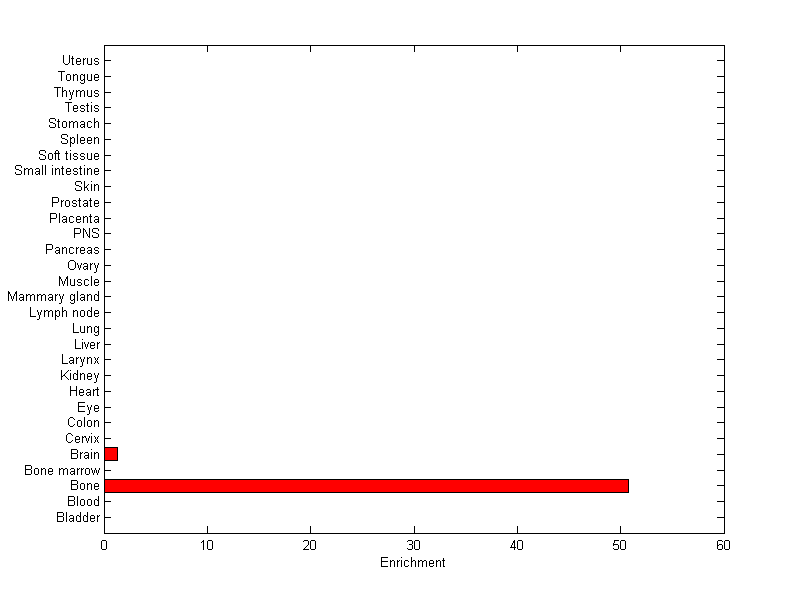 About the profile: The expression level is normalized with tissue-library size. Each value for a gene in a tissue is a ratio of observed ESTs to the expected one in this tissue. The expected number of ESTs is the product of total ESTs of the gene and the fraction of total ESTs in the tissue among all ESTs in 30 tissues. Summary: This gene is preferentially expressed in [bone] Download: |