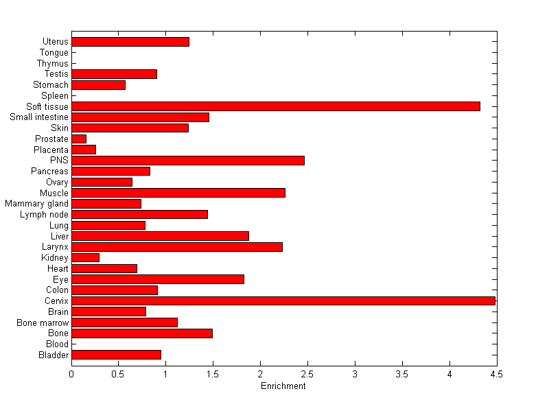 The expression level is normalized with tissue-library size. Each value for a gene in a tissue is a ratio of observed ESTs to the expected one in this tissue. The expected number of ESTs is the product of total ESTs of the gene and the fraction of total ESTs in the tissue among all ESTs in 30 tissues.
