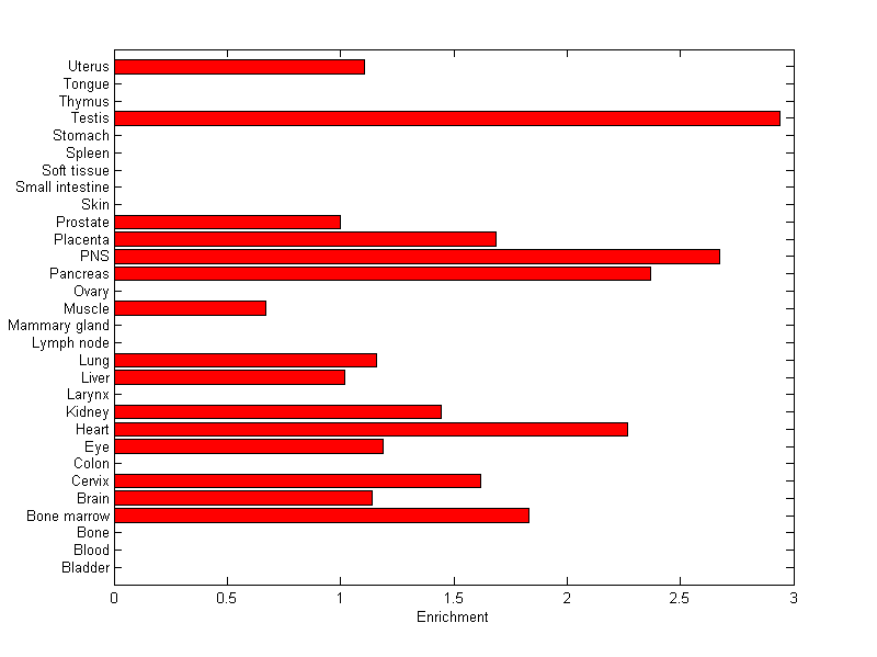 The expression level is normalized with tissue-library size. Each value for a gene in a tissue is a ratio of observed ESTs to the expected one in this tissue. The expected number of ESTs is the product of total ESTs of the gene and the fraction of total ESTs in the tissue among all ESTs in 30 tissues.