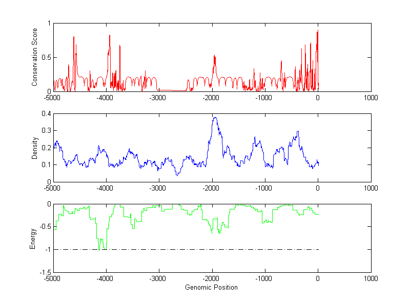 The energy profile (green curve) is about energy for module detection based on TF interaction. The positions with energy less than -1 indicate the existence of CRMs.
