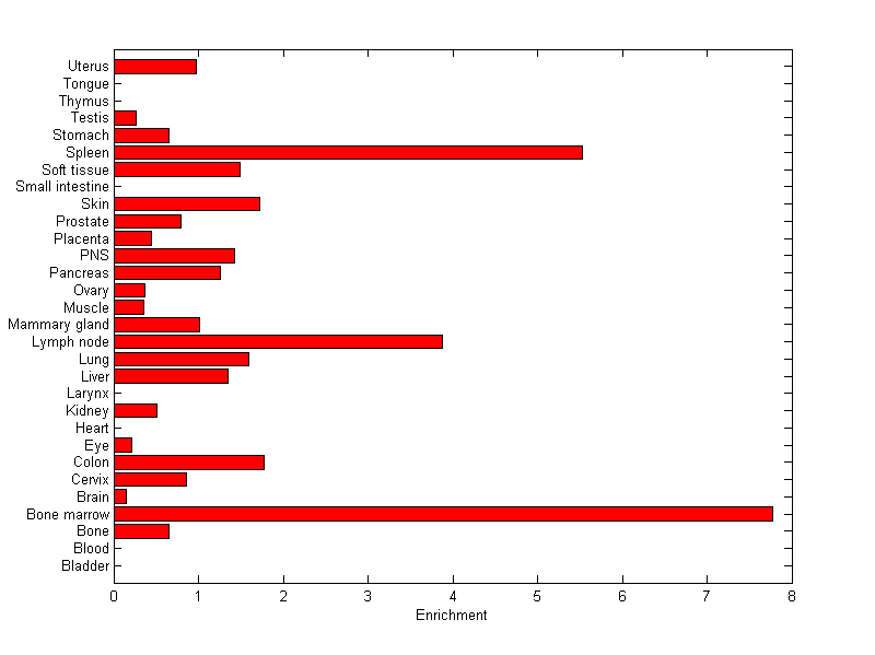 The expression level is normalized with tissue-library size. Each value for a gene in a tissue is a ratio of observed ESTs to the expected one in this tissue. The expected number of ESTs is the product of total ESTs of the gene and the fraction of total ESTs in the tissue among all ESTs in 30 tissues.