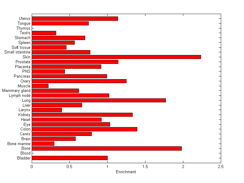 The expression level is normalized with tissue-library size. Each value for a gene in a tissue is a ratio of observed ESTs to the expected one in this tissue. The expected number of ESTs is the product of total ESTs of the gene and the fraction of total ESTs in the tissue among all ESTs in 30 tissues.