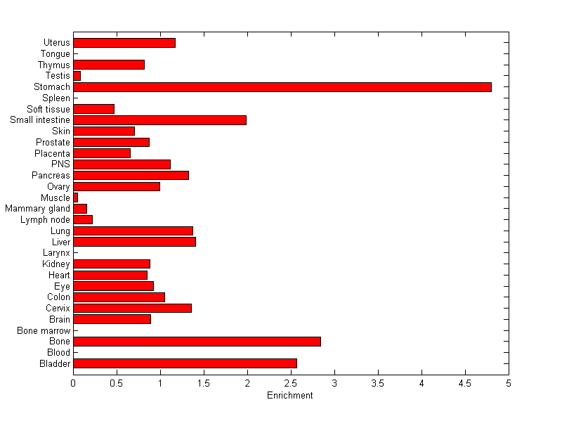 The expression level is normalized with tissue-library size. Each value for a gene in a tissue is a ratio of observed ESTs to the expected one in this tissue. The expected number of ESTs is the product of total ESTs of the gene and the fraction of total ESTs in the tissue among all ESTs in 30 tissues.