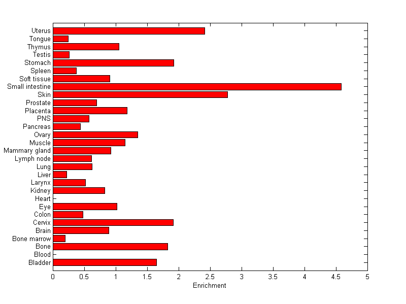 The expression level is normalized with tissue-library size. Each value for a gene in a tissue is a ratio of observed ESTs to the expected one in this tissue. The expected number of ESTs is the product of total ESTs of the gene and the fraction of total ESTs in the tissue among all ESTs in 30 tissues.