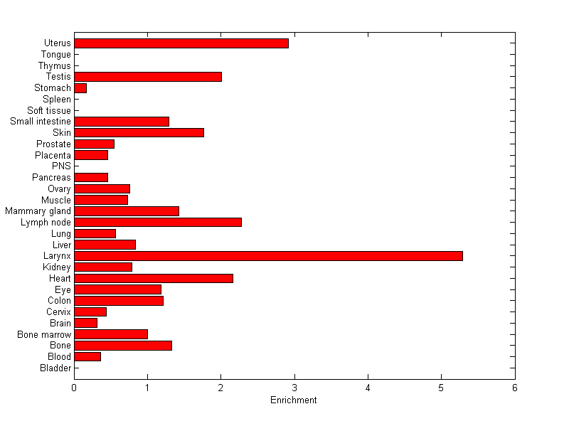 The expression level is normalized with tissue-library size. Each value for a gene in a tissue is a ratio of observed ESTs to the expected one in this tissue. The expected number of ESTs is the product of total ESTs of the gene and the fraction of total ESTs in the tissue among all ESTs in 30 tissues.