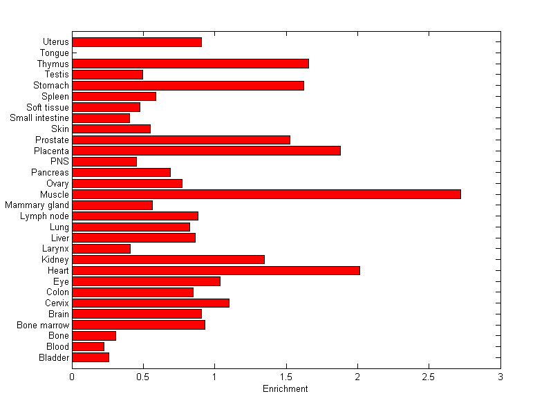 The expression level is normalized with tissue-library size. Each value for a gene in a tissue is a ratio of observed ESTs to the expected one in this tissue. The expected number of ESTs is the product of total ESTs of the gene and the fraction of total ESTs in the tissue among all ESTs in 30 tissues.