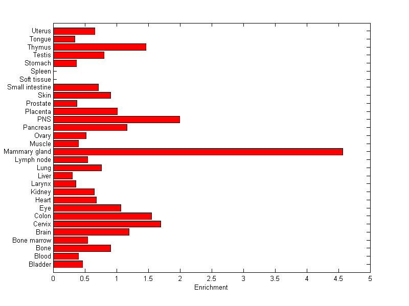 The expression level is normalized with tissue-library size. Each value for a gene in a tissue is a ratio of observed ESTs to the expected one in this tissue. The expected number of ESTs is the product of total ESTs of the gene and the fraction of total ESTs in the tissue among all ESTs in 30 tissues.