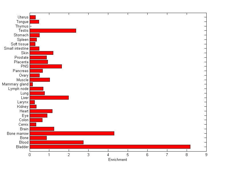 The expression level is normalized with tissue-library size. Each value for a gene in a tissue is a ratio of observed ESTs to the expected one in this tissue. The expected number of ESTs is the product of total ESTs of the gene and the fraction of total ESTs in the tissue among all ESTs in 30 tissues.