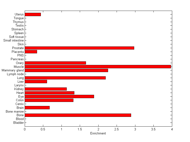 The expression level is normalized with tissue-library size. Each value for a gene in a tissue is a ratio of observed ESTs to the expected one in this tissue. The expected number of ESTs is the product of total ESTs of the gene and the fraction of total ESTs in the tissue among all ESTs in 30 tissues.