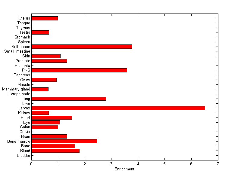 About the profile: The expression level is normalized with tissue-library size. Each value for a gene in a tissue is a ratio of observed ESTs to the expected one in this tissue. The expected number of ESTs is the product of total ESTs of the gene and the fraction of total ESTs in the tissue among all ESTs in 30 tissues. Download: |
