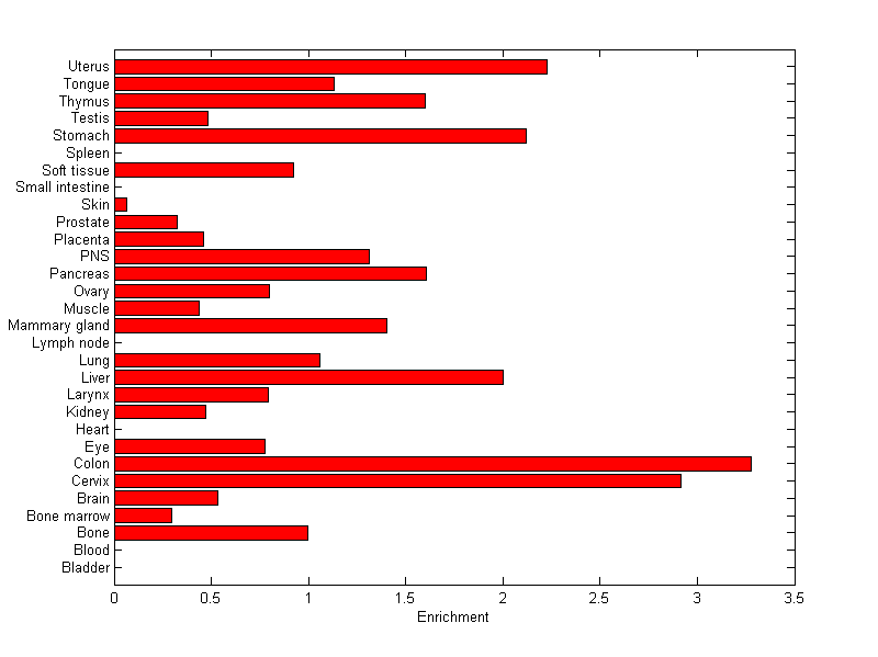 The expression level is normalized with tissue-library size. Each value for a gene in a tissue is a ratio of observed ESTs to the expected one in this tissue. The expected number of ESTs is the product of total ESTs of the gene and the fraction of total ESTs in the tissue among all ESTs in 30 tissues.