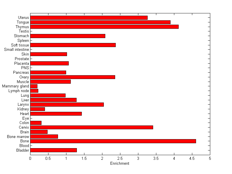 The expression level is normalized with tissue-library size. Each value for a gene in a tissue is a ratio of observed ESTs to the expected one in this tissue. The expected number of ESTs is the product of total ESTs of the gene and the fraction of total ESTs in the tissue among all ESTs in 30 tissues.