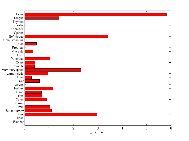 The expression level is normalized with tissue-library size. Each value for a gene in a tissue is a ratio of observed ESTs to the expected one in this tissue. The expected number of ESTs is the product of total ESTs of the gene and the fraction of total ESTs in the tissue among all ESTs in 30 tissues.