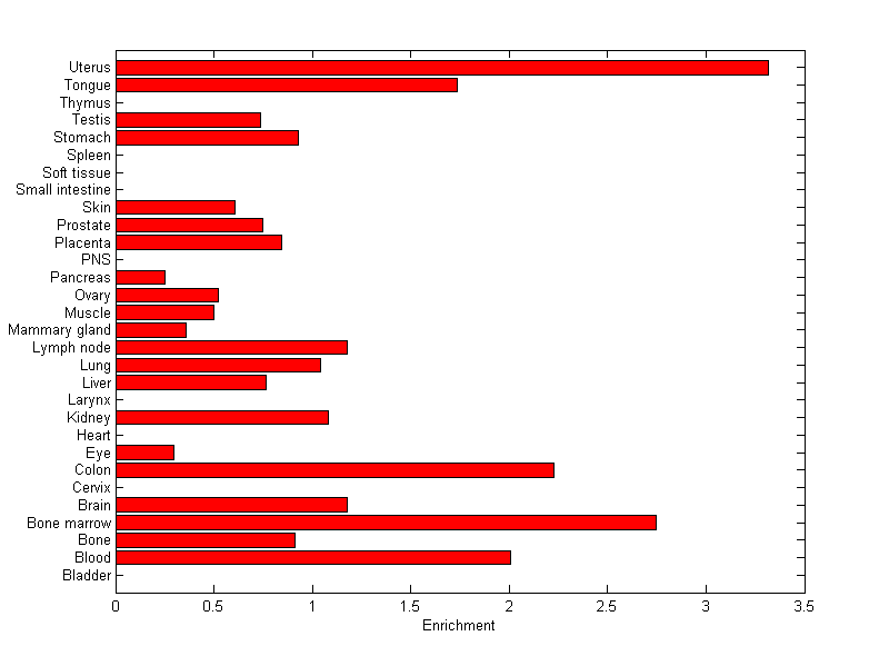 The expression level is normalized with tissue-library size. Each value for a gene in a tissue is a ratio of observed ESTs to the expected one in this tissue. The expected number of ESTs is the product of total ESTs of the gene and the fraction of total ESTs in the tissue among all ESTs in 30 tissues.