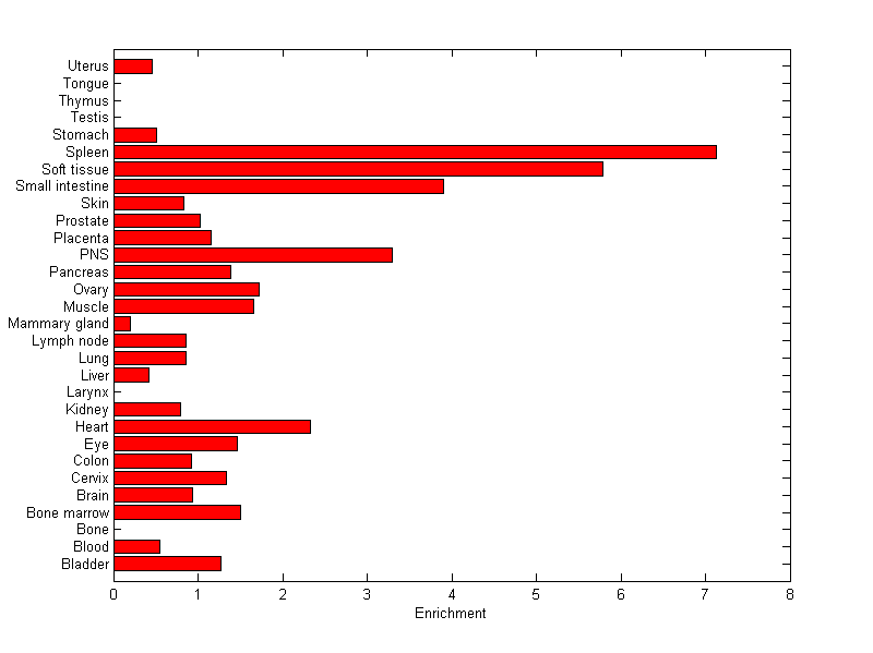 The expression level is normalized with tissue-library size. Each value for a gene in a tissue is a ratio of observed ESTs to the expected one in this tissue. The expected number of ESTs is the product of total ESTs of the gene and the fraction of total ESTs in the tissue among all ESTs in 30 tissues.