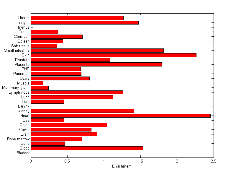 The expression level is normalized with tissue-library size. Each value for a gene in a tissue is a ratio of observed ESTs to the expected one in this tissue. The expected number of ESTs is the product of total ESTs of the gene and the fraction of total ESTs in the tissue among all ESTs in 30 tissues.