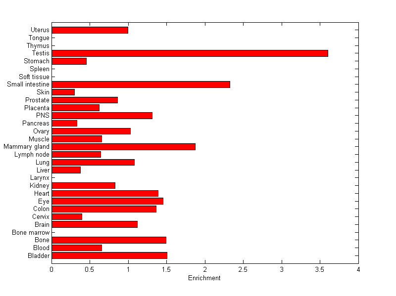 The expression level is normalized with tissue-library size. Each value for a gene in a tissue is a ratio of observed ESTs to the expected one in this tissue. The expected number of ESTs is the product of total ESTs of the gene and the fraction of total ESTs in the tissue among all ESTs in 30 tissues.