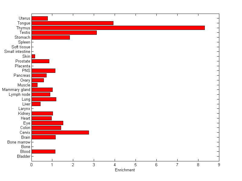 The expression level is normalized with tissue-library size. Each value for a gene in a tissue is a ratio of observed ESTs to the expected one in this tissue. The expected number of ESTs is the product of total ESTs of the gene and the fraction of total ESTs in the tissue among all ESTs in 30 tissues.