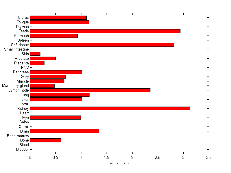 The expression level is normalized with tissue-library size. Each value for a gene in a tissue is a ratio of observed ESTs to the expected one in this tissue. The expected number of ESTs is the product of total ESTs of the gene and the fraction of total ESTs in the tissue among all ESTs in 30 tissues.