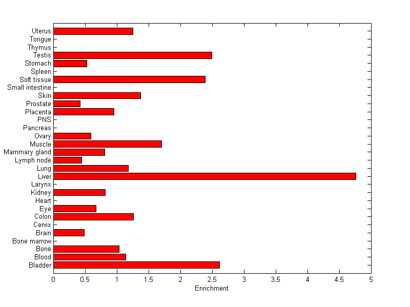 The expression level is normalized with tissue-library size. Each value for a gene in a tissue is a ratio of observed ESTs to the expected one in this tissue. The expected number of ESTs is the product of total ESTs of the gene and the fraction of total ESTs in the tissue among all ESTs in 30 tissues.