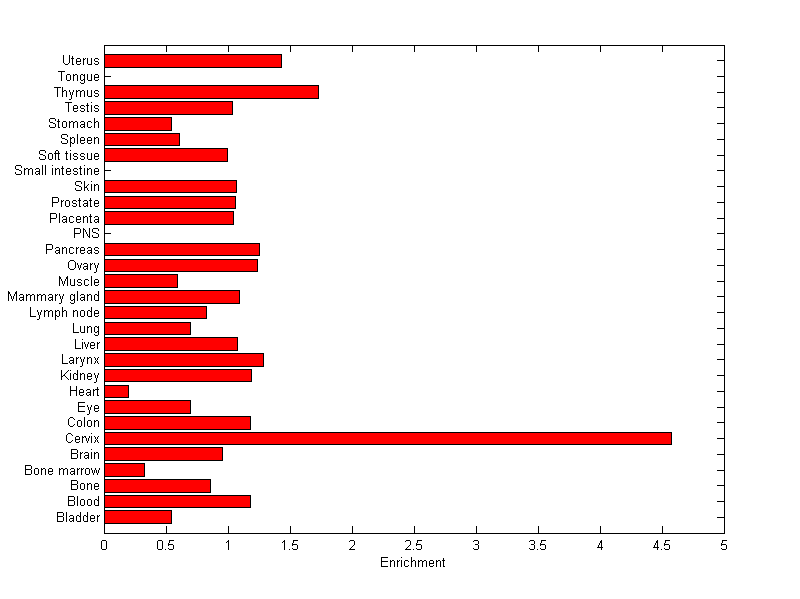 The expression level is normalized with tissue-library size. Each value for a gene in a tissue is a ratio of observed ESTs to the expected one in this tissue. The expected number of ESTs is the product of total ESTs of the gene and the fraction of total ESTs in the tissue among all ESTs in 30 tissues.