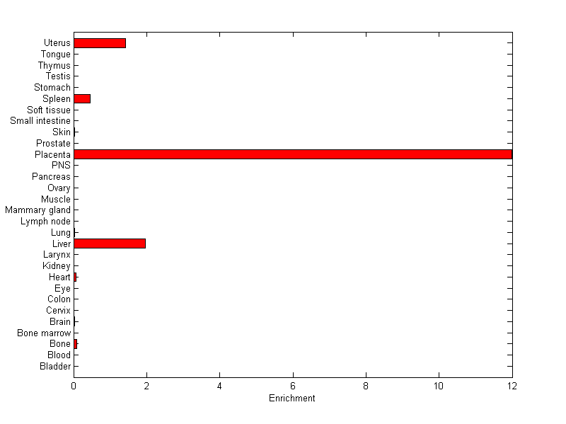 The expression level is normalized with tissue-library size. Each value for a gene in a tissue is a ratio of observed ESTs to the expected one in this tissue. The expected number of ESTs is the product of total ESTs of the gene and the fraction of total ESTs in the tissue among all ESTs in 30 tissues.