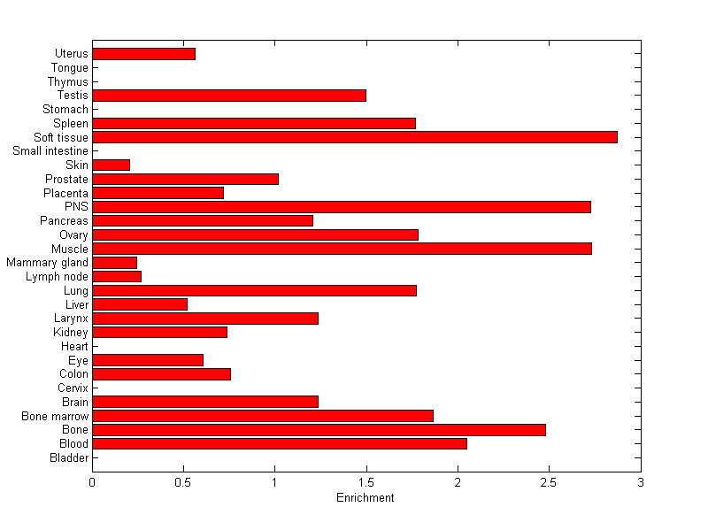 The expression level is normalized with tissue-library size. Each value for a gene in a tissue is a ratio of observed ESTs to the expected one in this tissue. The expected number of ESTs is the product of total ESTs of the gene and the fraction of total ESTs in the tissue among all ESTs in 30 tissues.