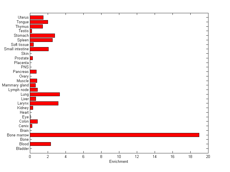 The expression level is normalized with tissue-library size. Each value for a gene in a tissue is a ratio of observed ESTs to the expected one in this tissue. The expected number of ESTs is the product of total ESTs of the gene and the fraction of total ESTs in the tissue among all ESTs in 30 tissues.