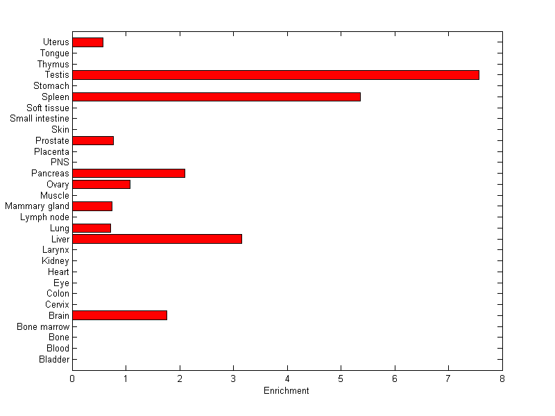 The expression level is normalized with tissue-library size. Each value for a gene in a tissue is a ratio of observed ESTs to the expected one in this tissue. The expected number of ESTs is the product of total ESTs of the gene and the fraction of total ESTs in the tissue among all ESTs in 30 tissues.
