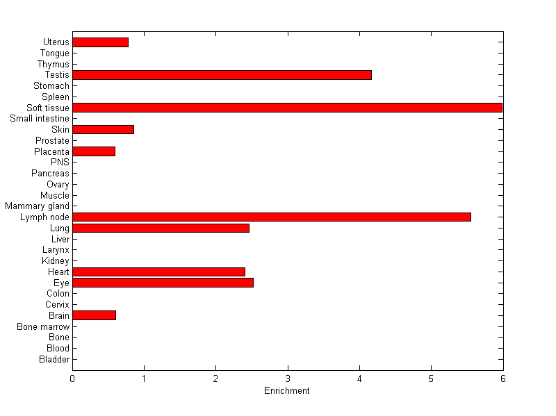 The expression level is normalized with tissue-library size. Each value for a gene in a tissue is a ratio of observed ESTs to the expected one in this tissue. The expected number of ESTs is the product of total ESTs of the gene and the fraction of total ESTs in the tissue among all ESTs in 30 tissues.