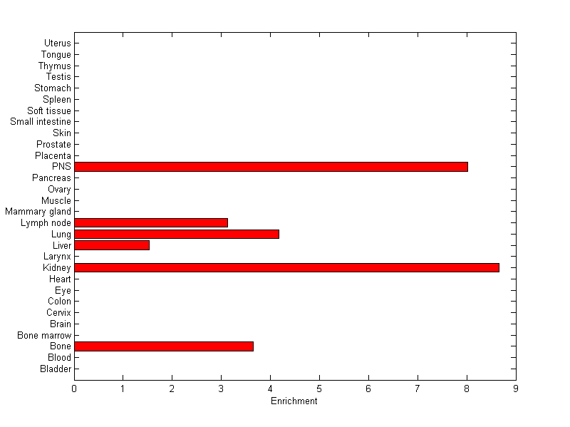 The expression level is normalized with tissue-library size. Each value for a gene in a tissue is a ratio of observed ESTs to the expected one in this tissue. The expected number of ESTs is the product of total ESTs of the gene and the fraction of total ESTs in the tissue among all ESTs in 30 tissues.