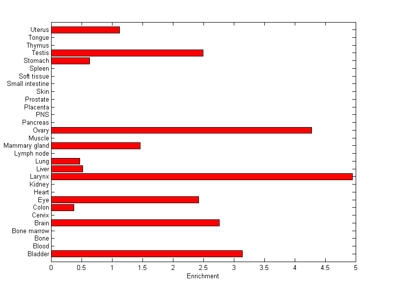 The expression level is normalized with tissue-library size. Each value for a gene in a tissue is a ratio of observed ESTs to the expected one in this tissue. The expected number of ESTs is the product of total ESTs of the gene and the fraction of total ESTs in the tissue among all ESTs in 30 tissues.