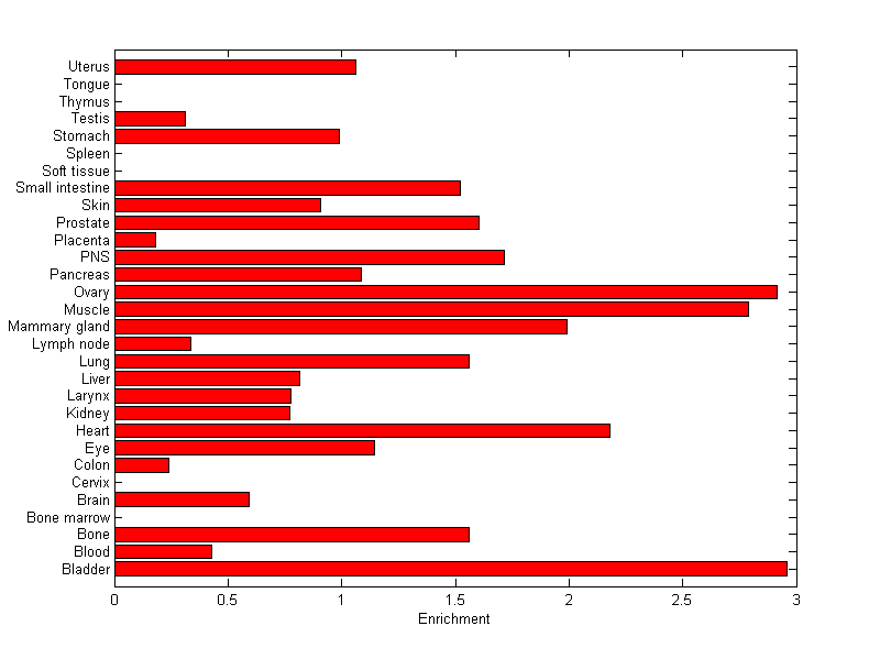 The expression level is normalized with tissue-library size. Each value for a gene in a tissue is a ratio of observed ESTs to the expected one in this tissue. The expected number of ESTs is the product of total ESTs of the gene and the fraction of total ESTs in the tissue among all ESTs in 30 tissues.