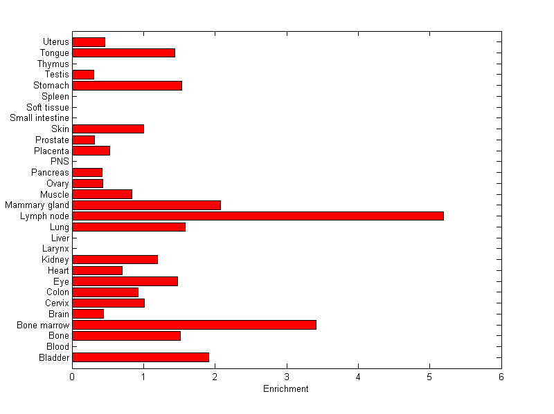 The expression level is normalized with tissue-library size. Each value for a gene in a tissue is a ratio of observed ESTs to the expected one in this tissue. The expected number of ESTs is the product of total ESTs of the gene and the fraction of total ESTs in the tissue among all ESTs in 30 tissues.