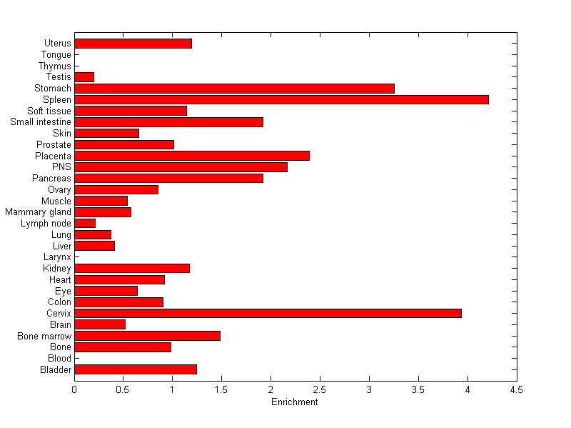 The expression level is normalized with tissue-library size. Each value for a gene in a tissue is a ratio of observed ESTs to the expected one in this tissue. The expected number of ESTs is the product of total ESTs of the gene and the fraction of total ESTs in the tissue among all ESTs in 30 tissues.
