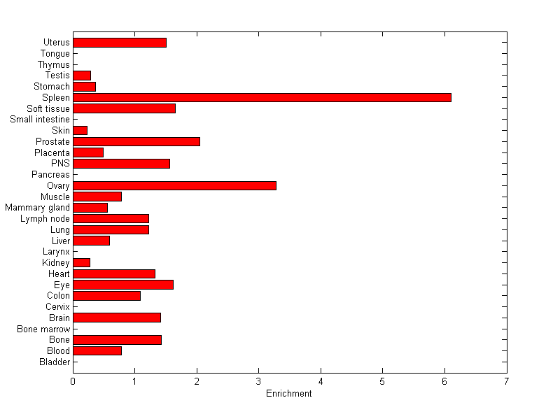 The expression level is normalized with tissue-library size. Each value for a gene in a tissue is a ratio of observed ESTs to the expected one in this tissue. The expected number of ESTs is the product of total ESTs of the gene and the fraction of total ESTs in the tissue among all ESTs in 30 tissues.