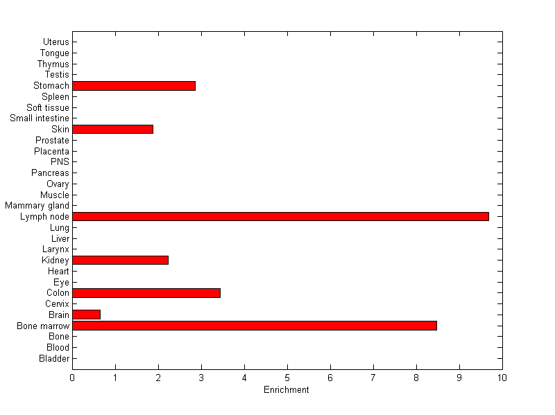 The expression level is normalized with tissue-library size. Each value for a gene in a tissue is a ratio of observed ESTs to the expected one in this tissue. The expected number of ESTs is the product of total ESTs of the gene and the fraction of total ESTs in the tissue among all ESTs in 30 tissues.