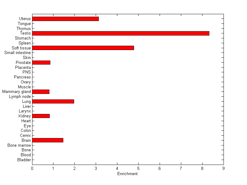 The expression level is normalized with tissue-library size. Each value for a gene in a tissue is a ratio of observed ESTs to the expected one in this tissue. The expected number of ESTs is the product of total ESTs of the gene and the fraction of total ESTs in the tissue among all ESTs in 30 tissues.