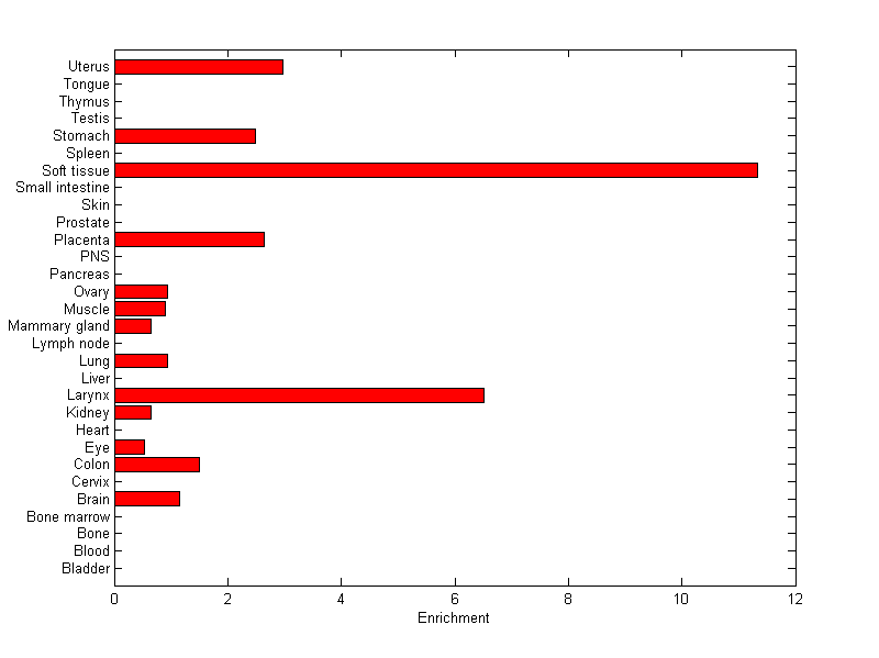 The expression level is normalized with tissue-library size. Each value for a gene in a tissue is a ratio of observed ESTs to the expected one in this tissue. The expected number of ESTs is the product of total ESTs of the gene and the fraction of total ESTs in the tissue among all ESTs in 30 tissues.