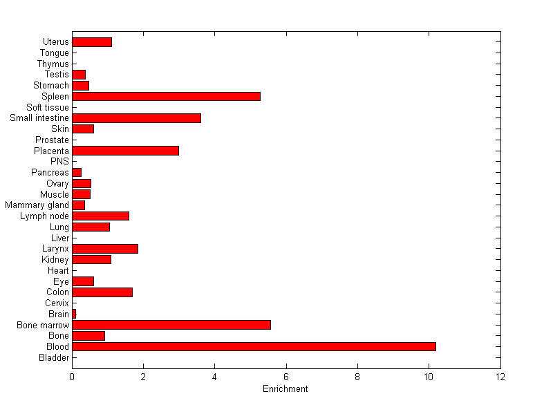 The expression level is normalized with tissue-library size. Each value for a gene in a tissue is a ratio of observed ESTs to the expected one in this tissue. The expected number of ESTs is the product of total ESTs of the gene and the fraction of total ESTs in the tissue among all ESTs in 30 tissues.