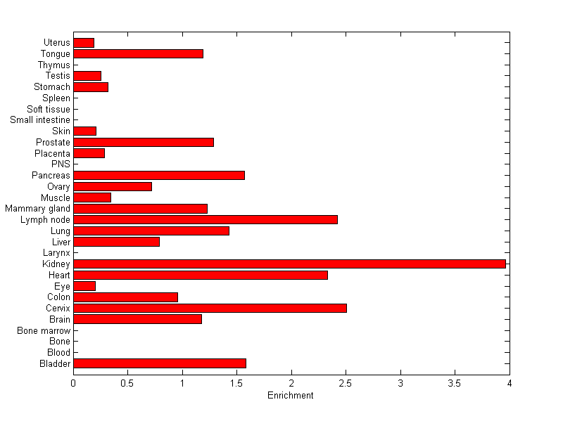 The expression level is normalized with tissue-library size. Each value for a gene in a tissue is a ratio of observed ESTs to the expected one in this tissue. The expected number of ESTs is the product of total ESTs of the gene and the fraction of total ESTs in the tissue among all ESTs in 30 tissues.