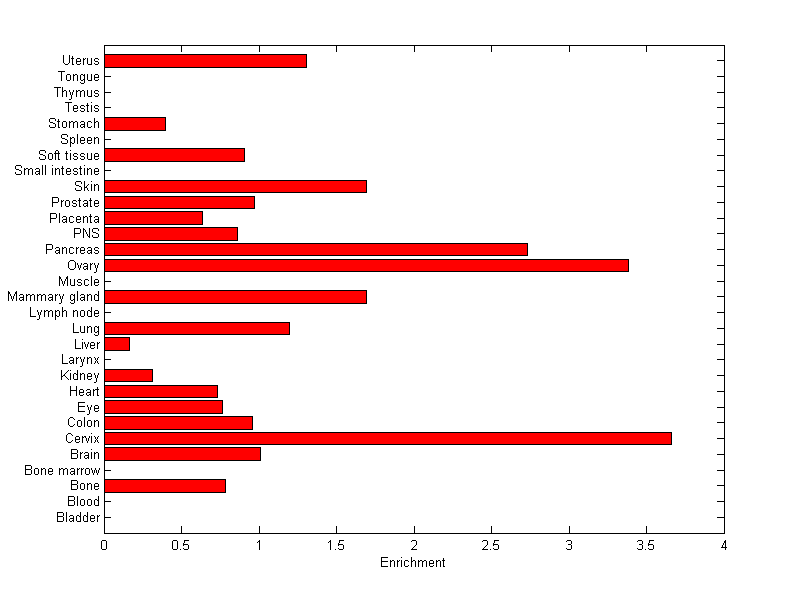 The expression level is normalized with tissue-library size. Each value for a gene in a tissue is a ratio of observed ESTs to the expected one in this tissue. The expected number of ESTs is the product of total ESTs of the gene and the fraction of total ESTs in the tissue among all ESTs in 30 tissues.