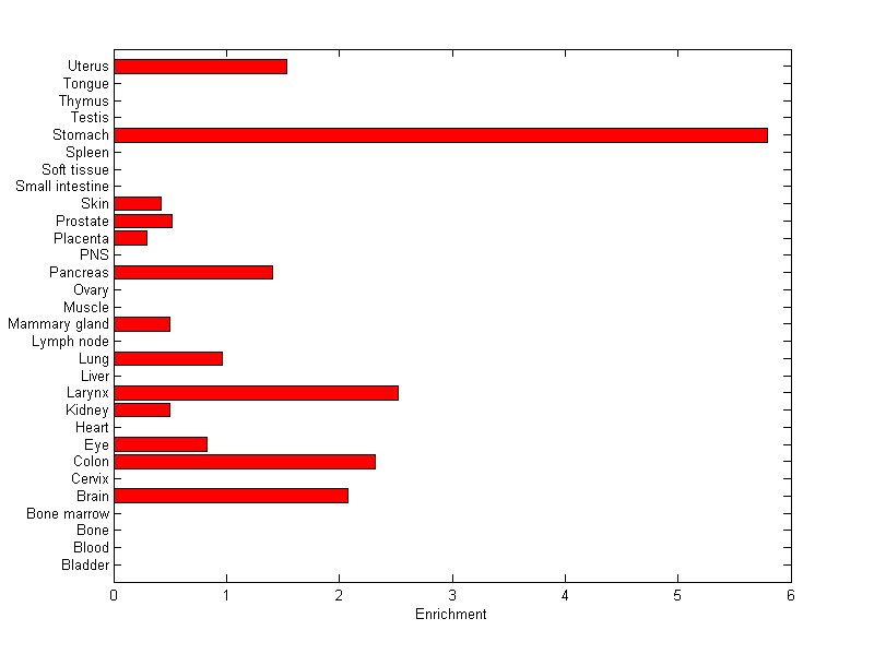 The expression level is normalized with tissue-library size. Each value for a gene in a tissue is a ratio of observed ESTs to the expected one in this tissue. The expected number of ESTs is the product of total ESTs of the gene and the fraction of total ESTs in the tissue among all ESTs in 30 tissues.