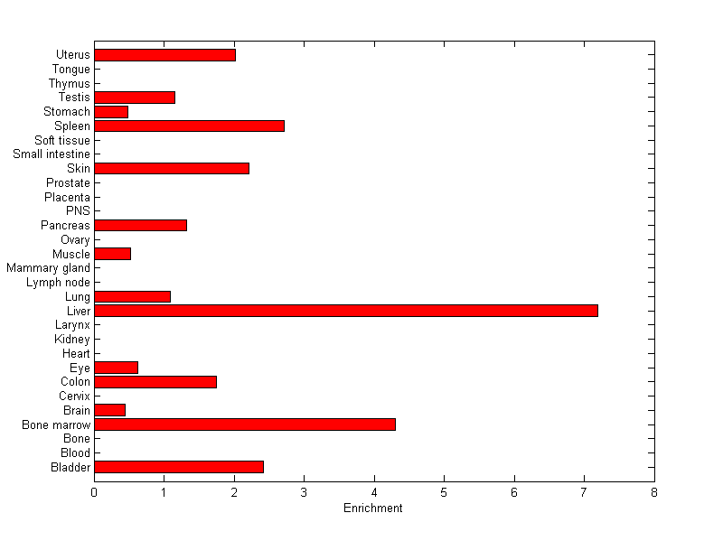 The expression level is normalized with tissue-library size. Each value for a gene in a tissue is a ratio of observed ESTs to the expected one in this tissue. The expected number of ESTs is the product of total ESTs of the gene and the fraction of total ESTs in the tissue among all ESTs in 30 tissues.