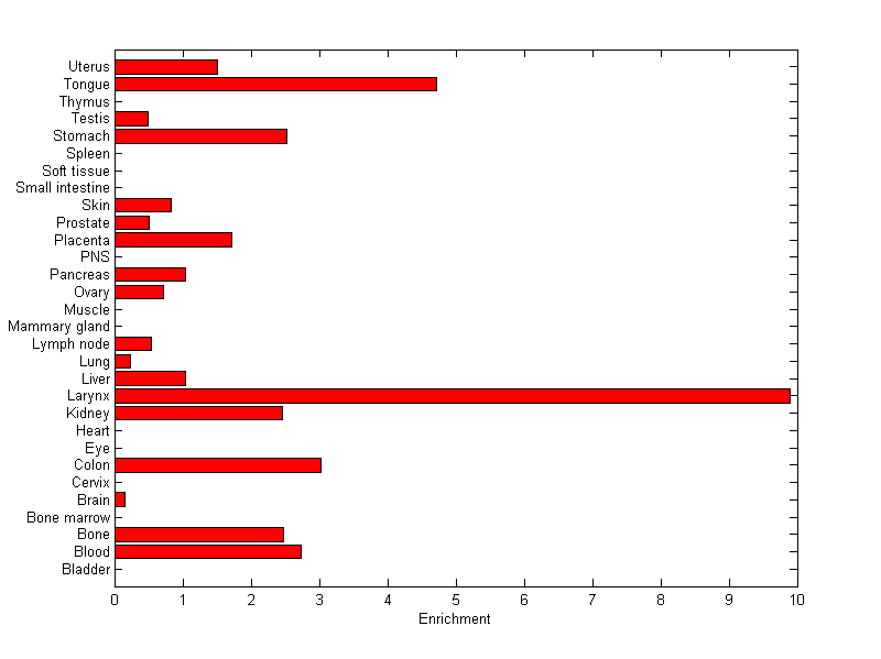 The expression level is normalized with tissue-library size. Each value for a gene in a tissue is a ratio of observed ESTs to the expected one in this tissue. The expected number of ESTs is the product of total ESTs of the gene and the fraction of total ESTs in the tissue among all ESTs in 30 tissues.
